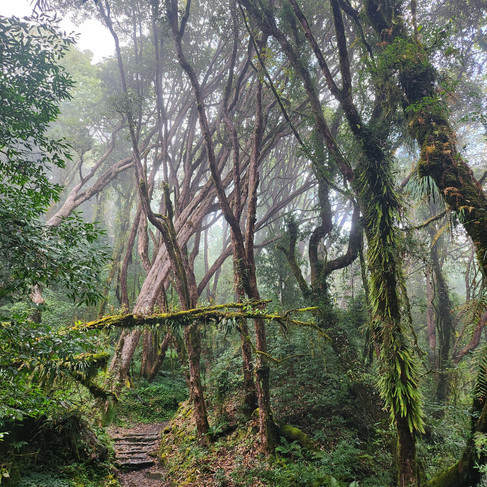 Mais bientôt, nous pénétrons dans ces fantastiques forêts népalaises accrochées aux flans de ces montagnes aux environs de 3000-3500m. La forêt est d’abord une jungle, avec ses lianes, ses plantes parasites accrochées aux troncs, ses gargantuesques lichens qui pendent des branches, fougères géantes, énormes bouquets de bambous, tout y est.