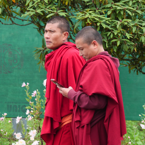 Le col arrive enfin, la température a nettement chuté, nous sommes à plus de 3000m. Malheureusement, le panorama promis sur l’Himalaya nous échappe encore une fois, les nuages sont accrochés au col, il bruine : aurions-nous été téléportés sur la côte belge ? Mais non, une enfilade de petites stupas et des moines en toge nous ramènent bien au Bhutan. 108 stupas, c’est le nombre magique que l’on retrouve dans de très nombreux lieux saints dans toute la culture tibétaine, pour commémorer des soldats tombés lors d’escarmouches avec l’Inde voisine. L’alignement semble sortir de la brume au milieu de la forêt, soulignant la magie du lieu.