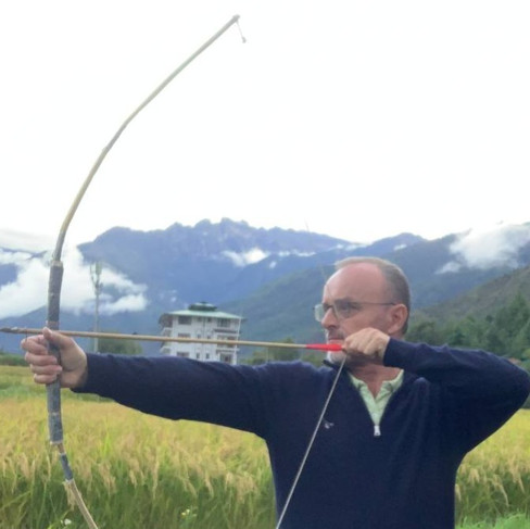 Sur la route du retour, nous faisons une petite halte sur un site de tir à l’arc. C’est le sport national du Bhutan, laissé en héritage par les lointains descendants mongols des tribus de Gengish Khan quand elles écumaient toute l’Asie. La cible est très loin (plus de 100m), très petite (30 cm de diamètre) et la corde de l’arc impossible à bander: si un épreuve de tir à l’arc est comprise dans l’indice BNB, je vais faire plonger le pays en dépression collective à moi tout seul.